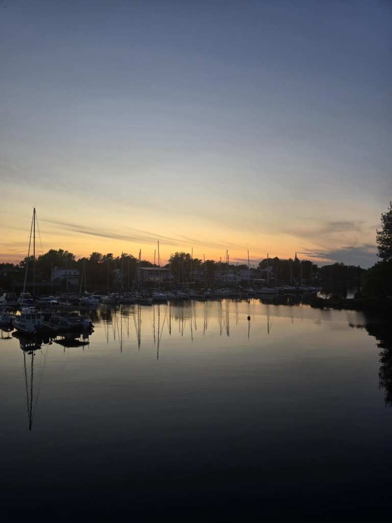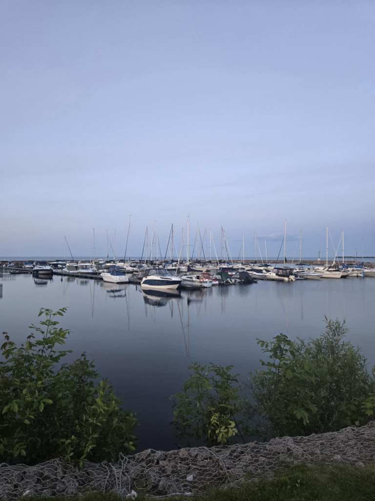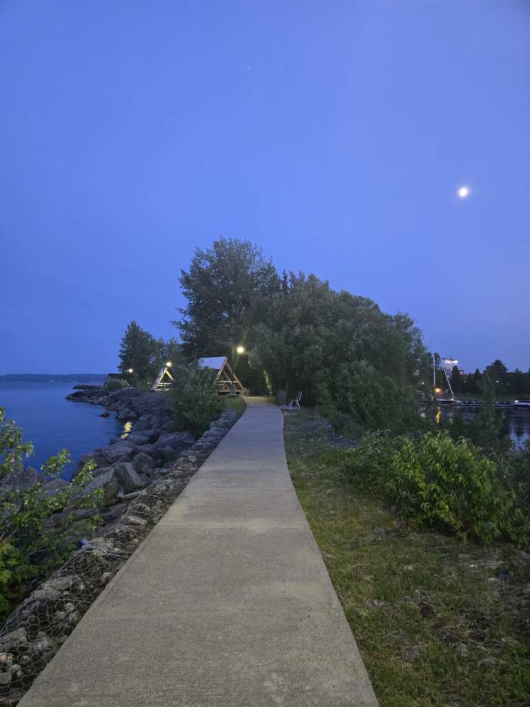 Le dernier boute de route de la journée est long pis relativement plate. À cette heure-là, on a pas mal de kilomètres derrière la cravate pis on commence à avoir faim. À admirer pendant cette dernière grosse heure de route, des arbres, des arbres, des arbres, pis des sapins. 🌳🌳🌳🌲 À mon avis, Evelyne doit pas être loin de penser qu’elle s’en est fait passer un en acceptant ce « petit » road trip. En arrivant finalement à Roberval, on se garroche au Normandin pour manger au plus sacrant. Y commence à être tard pis on aimerait bien avoir le temps d’aller voir le bord de l’eau avec un minimum de lumière. Le repas au Normandin satisfait tout le monde. On se dirige après à la petite marina juste à côté. ⛵⛵⛵ En 2023, j’étais venue marcher ici. Le quai est super le fun pis les aménagements autours sont vraiment jolis. Je sais d’avance que ça va plaire à mon père pis aux deux autres routards. À l’heure qu’il est, la lumière est juste parfaite pour profiter des lieux. On marche trois quart d’heures pis on prend des photos. Le temps est absolument idéal pour ça.