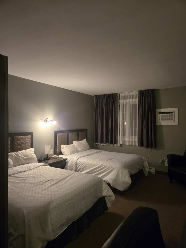 Les chambres ici sont d’une propreté correcte mais vieillottes, autant au point de vue de la déco que des équipements. Mon père pis moi, on a du tapis dans nos chambres pis des gros bains tourbillon en coin des années ’80. Pas ben pratique pour une personne âgée espérant prendre une douche. 🚑 En plus, mon étage est envahi par les jeunes d’une équipe de hockey des Premières Nations. Y sont on ne peut plus bruyants. Je m’endors quand même assez vite en croisant les doigts pour que mon père passe une bonne nuit. Aujourd’hui, j’ai roulé 650 km pis descendu du char 42 fois. C’est quasiment une bonne chose qu’on ait pas dormi à La Baie. On aurait fait 100 km de plus. Dans ma chambre un peu lette, je m’endors sur ste réflexion-là. 🛌
