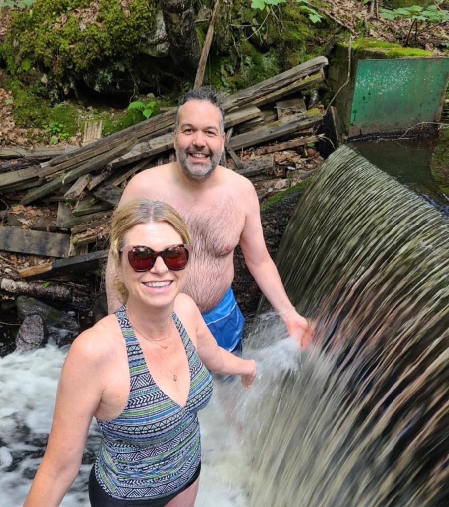 Dans la trail, y’a un genre de campeur illégal épeurant installé là avec sa tente pis une chaise. ⛺ Mon frère lance à la blague qu’à cause de l’heure avancée, y vient de finir de souper pis qu’y se prépare à se coucher. On rit. Ça nous prend pas grand chose. Fallait être sur place pour la trouver drôle. 🤣 En repartant un peu plus loin, on repasse à l’heure normale. Mystère. 👀 La visite du Rapide Blanc comporte toujours un petit tour en haut du barrage pis une virée autour des cinq-six maisons encore existantes. Cette année, le site est vraiment tranquille. Pas de travailleurs, pas de « touristes ». On est tout fin seul. À la maison, rien à signaler. On reprend la route dans le sens inverse pour aller prendre notre douche annuelle dans la petite cascade frette, un peu plus loin, en direction de La Trenche. Sul chemin, on décide d’aller enquêter sur la provenance de st’eau-là dans laquelle on se lave depuis des années. On découvre une petite crique agrémentée d’un barrage de castors. 🦫 Plus loin, sur un chemin jamais emprunté, on aboutit dans une grosse carrière de montagnes de sable. À partir de maintenant, ça va nous faire une nouvelle attraction à venir surveiller.