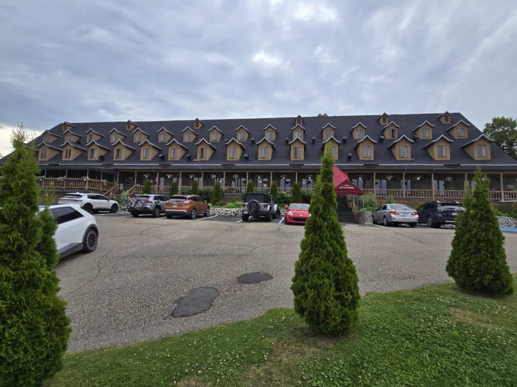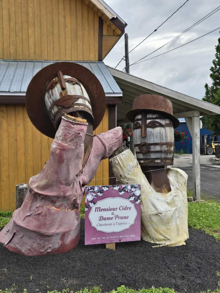 L’Isle-aux-coudres, c’est pas gros. Pour notre tournée des lieux, on suit le conseil de la petite madame d’hier soir pis on part en sens anti-horaire, de façon à rouler drette sul bord du fleuve. Chanceux comme pas possible, y fait encore relativement beau aujourd’hui. On aurait pas pu tomber sur meilleure fin de semaine. La première attraction à voir ici, c’est la maison croche. Ste maison-là a été construite croche volontairement par une monsieur qui trouvait que les maisons de l’île étaient trop uniformes. Apparemment, les Coudrilois sont pas trop fans de son idée. Moi je trouve ça inusité pis rigolo. Y fallait y penser quand même. Asteur, le génie derrière la construction de ste maison-là est décédé. Le bâtiment appartient à ceux qui possèdent le resto drette en face pis la cidrerie, située un peu plus loin. 🍎🍏