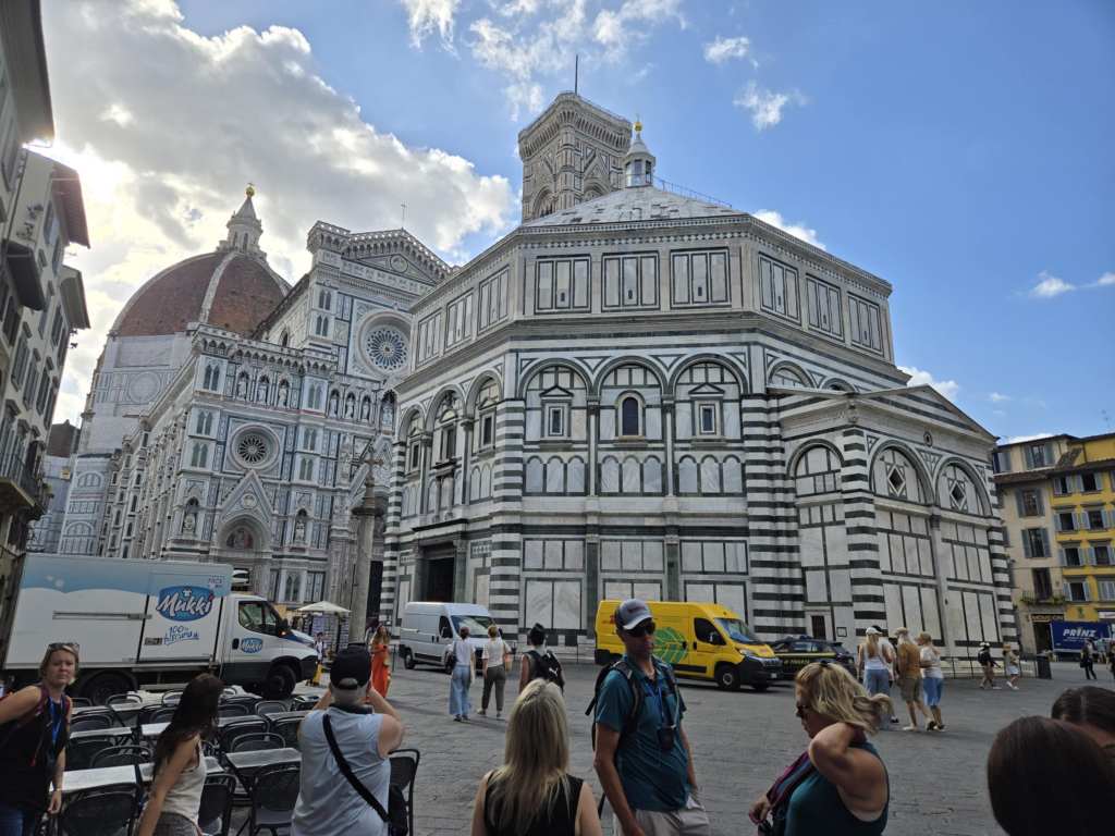 Aujourd’hui, on part pour la journée mais on revient dormir ici ce soir. Pas besoin donc de remballer tous les bagages. Après manger, je monte me brosser les dents pis préparer mon sac à dos. 7h30, je suis fin prête à la porte de l’hôtel. Pour nos déplacements, on roule dans un autobus « de luxe » conduit par Luigi, un italien d’une cinquantaine d’années, assez bel homme, mince, grisonnant, portant jean bleu, chemise blanche, veston bleu marine pis baskets blanches. À 8h. précises, on monte dans le bus. Lucy s’installe en avant avec un micro. 🎙️ Aujourd’hui, on s’en va découvrir Florence. Pendant qu’on roule, Lucy nous briefe sur le déroulement de la journée pis commente les alentours avec toutes sortes d’informations intéressantes sur la ville, les rues, les bâtiments. Enfin, mon voyage commence. 🙂 En arrivant à destination, tout le monde descend du bus. Lucy ouvre un parapluie rose afin qu’on la perde jamais de vue. Elle me remet aussi une petite radio à enfiler autour du cou avec une oreillette pour l’entendre parler. Moi, j’ai jamais fait ça un voyage organisé. Je pensais que la guide gueulerait dans toute la ville pis que j’entendrais rien. Je suis contente que ça soit pas le cas. Lucy nous guide par des jolies rues jusqu’à la cathédrale Santa Maria del Fiore. ⛪ Franchement, je pense que j’ai jamais vu quelque chose d’aussi beau de toute ma vie. J’en ai quasiment envie de pleurer. 😢 Bon, y faut dire que je suis fatiguée aussi. Pis que c’est quasiment un miracle que je me sois rendue jusqu’ici.