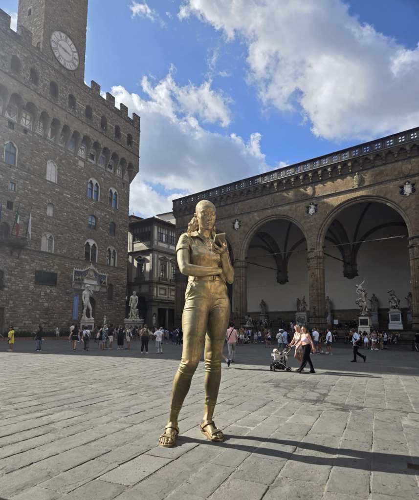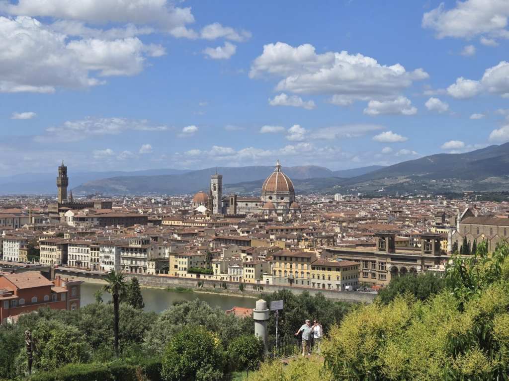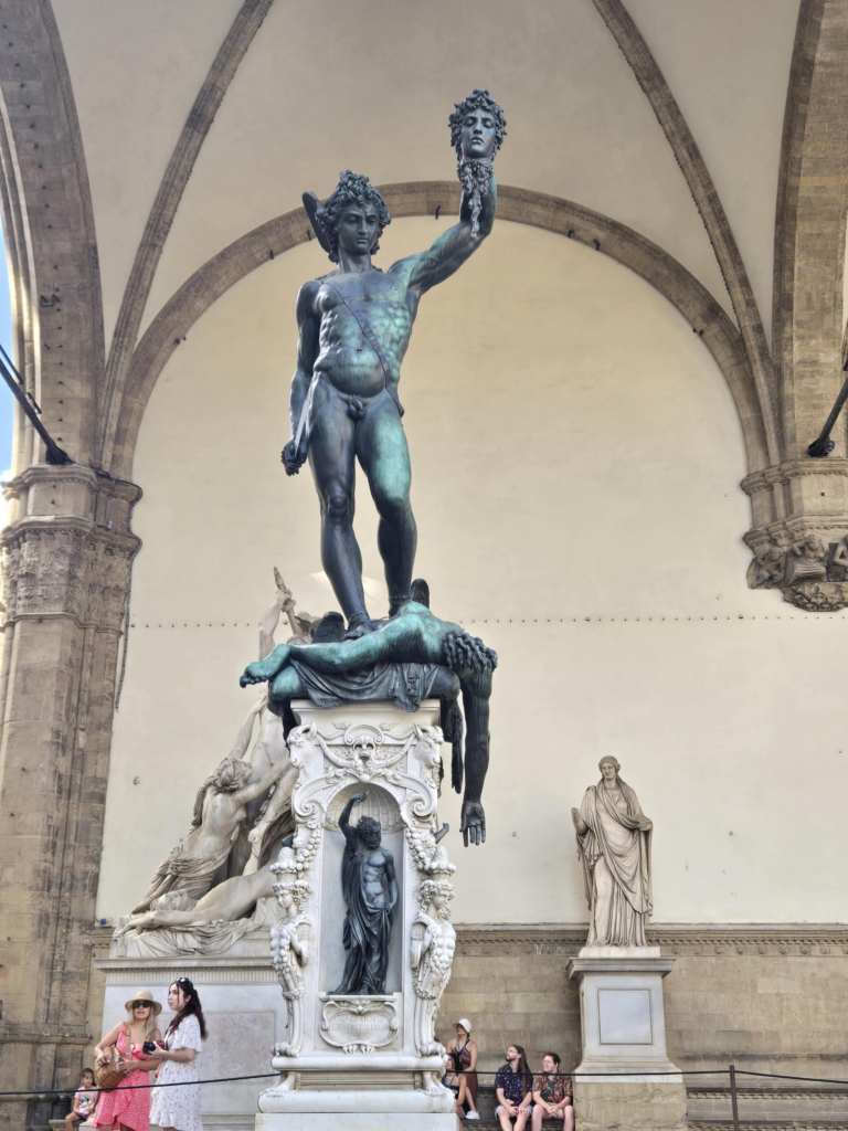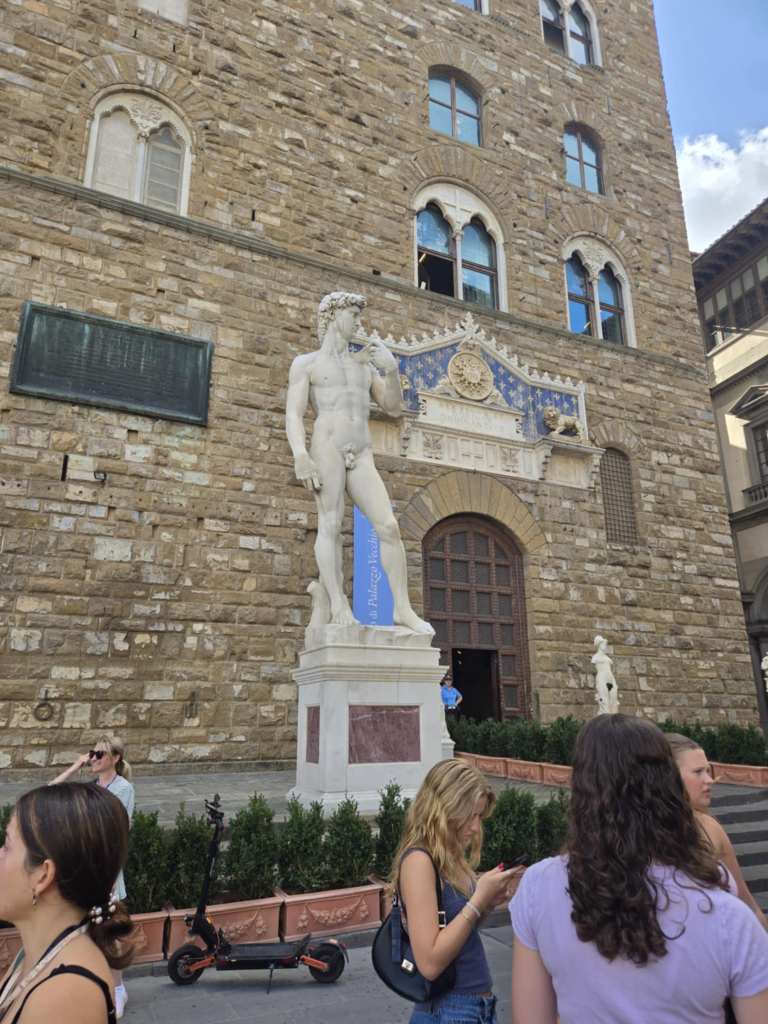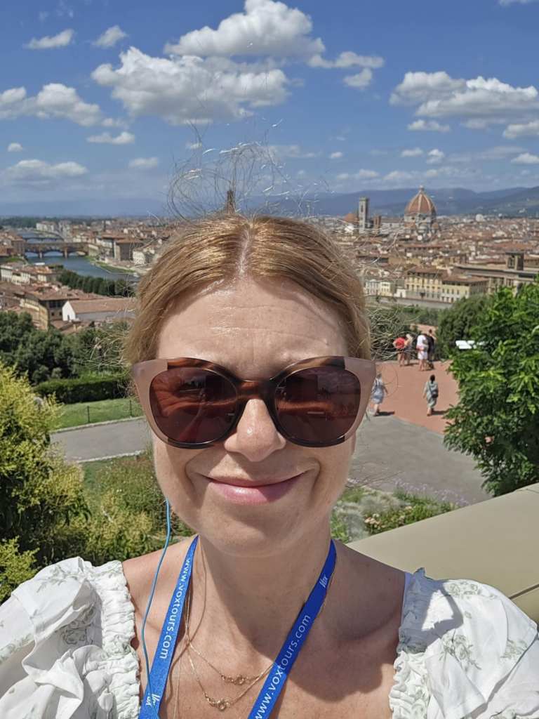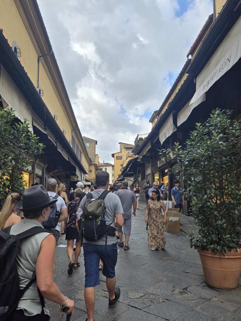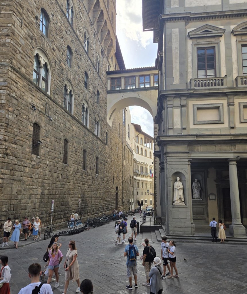 Devant la cathédrale, Lucy nous abandonne aux bons soins d’Alice, une guide parisienne, spécialiste des attractions de Florence. La visite avec elle est tout simplement extraordinaire. 🤩 Elle nous raconte l’histoire de la famille Médicis, dont les membres sont passés de simples exploitants agricoles à banquiers puis à dirigeants de la république de Florence, il y a de ça plusieurs siècles. Deux des membres de cette famille, Marie et Catherine, la plus connue des deux, ont même accédé à la royauté en épousant des rois de France. Ici, tout ce qu’on voit a été construit pour ou par les Médicis ou a un lien quelconque avec ste famille-là. C’est fascinant. Après la cathédrale, je suis particulièrement impressionnée par la Piazza della Seignoria, véritable musée à ciel ouvert où on peut voir de nombreuses sculptures originales ainsi qu’un reproduction du David de Michel-Ange. Juste à côté, on peut admirer le Palazzo Vecchio pis le Corridor de Vasari, passage protégé, couvert pis surélevé d’une longueur d’un kilomètre, par lequel les Médicis pouvaient se déplacer entre les bâtiments. Un peu plus loin, on a la chance de marcher sur le Ponte Vecchio, qui érigé en 1345, constitue le pont le plus ancien de la ville. Des deux côtés de ste pont-là se trouvent une multitude de bijouteries faisant de l’endroit un haut lieu de la joaillerie de luxe de l’Italie. Toutes ces attractions-là sont magnifiques. 😍 J’ai peine à croire que j’ai la chance de visiter ça.