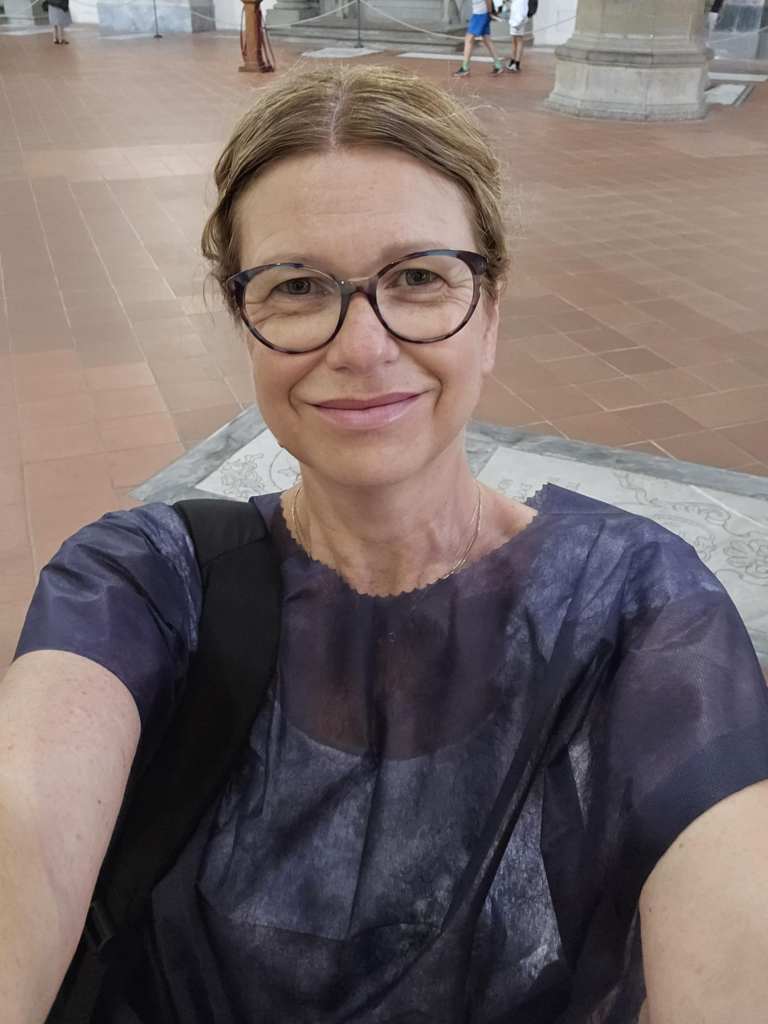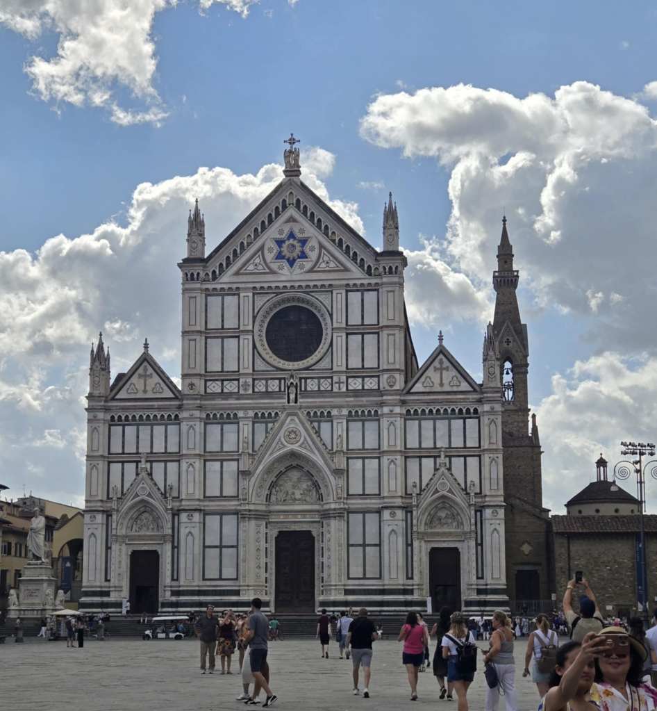 Après la super visite avec Alice, on retrouve Lucy à la Piazza Santa Croce. C’est ici qu’on va dîner tantôt. Lucy nous montre l’emplacement du petit resto avant de nous laisser libres pour une heure et demie. Au choix, on peut flâner dans les boutiques et kiosques des environs ou visiter la basilique Santa Croce. ⛪ Dehors, il fait déjà 32º pis le soleil tape fort. 🌞🌞🌞 Je décide de me réfugier dans la basilique qui est un chef d’œuvre d’architecture pis d’œuvres d’art. Au moment d’entrer, l’agent posté à la porte me jette un regard sévère pis me fait enfiler une robe en papier. Ça ben l’air que mon linge fait pas son affaire. 🤷♀️ À l’intérieur d’ailleurs, on est plusieurs femmes avec ste jaquette-là tandis que d’autres portent leurs vêtements normaux. Je comprends pas trop quel est le critère de sélection. 🤔 Je vais demander à Lucy plus tard.