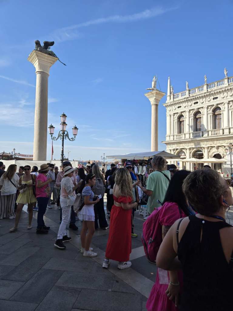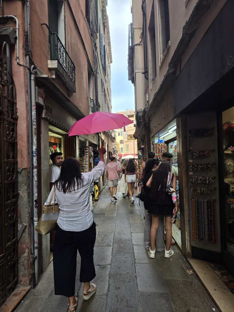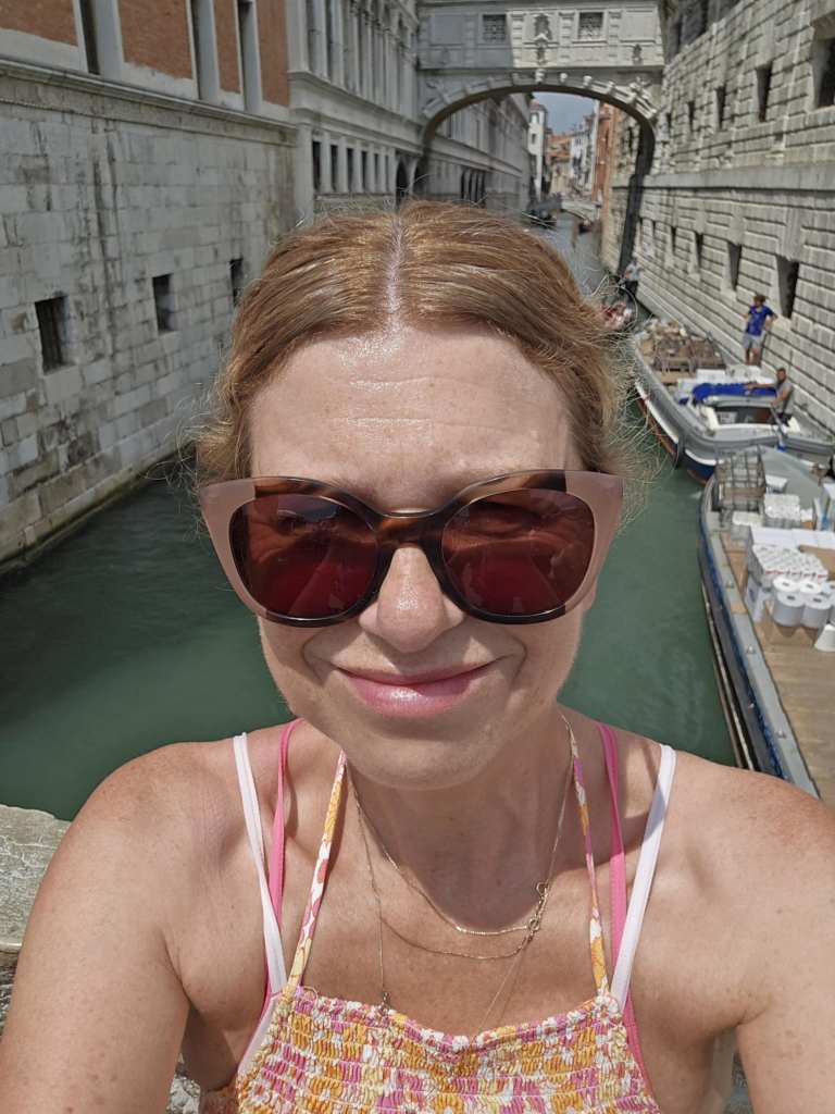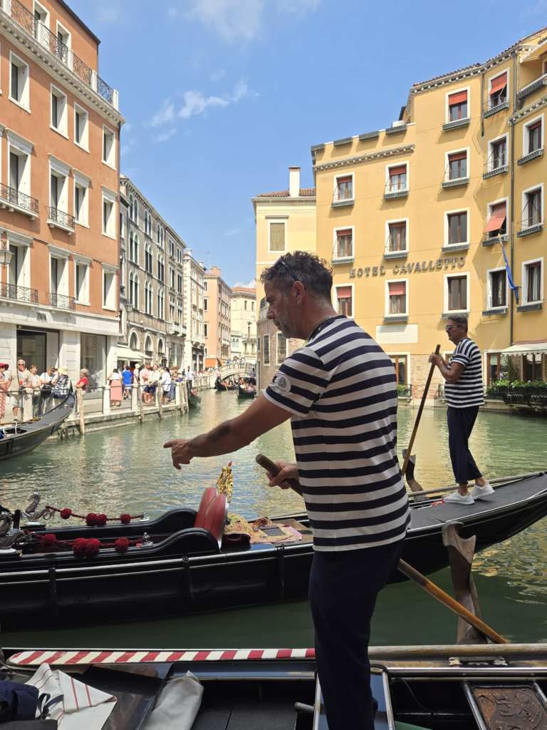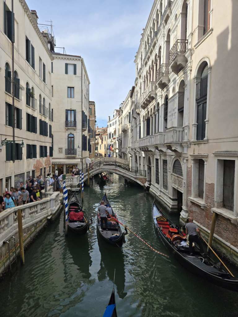 Ça fait quoi une année jubilaire ? Ça attire du monde. Beaucoup de monde. Des pélerins surtout, qui jubilent je présume 🤣, surtout à Rome pis au Vatican mais qui en profitent aussi pour visiter le reste de l’Italie. Faque aujourd’hui, y’a du monde ici. Y faut faire bien attention aux pick pocket. D’ailleurs, on nous le répète plusieurs fois par jour depuis que je suis arrivée. Bref, y’a du monde pis y fait chaud. Terriblement chaud. 🥵 Pis à Venise, de la verdure, y’en a pas ben ben. Dans tout ce que je marche, j’identifie peut-être huit arbres, tous au même endroit. Sinon, y’a pas de pelouse, pas d’espaces verts, peu de bancs, aucune ombre. Tout ce qu’il y a ici, c’est du marbre, BEAUCOUP de marbre, de la pierre, de la brique, des ponts, des canaux pis des gondoles. Icitt, tu marches. 🚶♀️ Pas de voitures évidemment mais pas le droit de faire de vélo non plus sauf en certains endroits aménagés pour les enfants uniquement. Ah pis quand la marée monte, l’eau traverse le sol. C’est assez spécial à constater. D’ailleurs, à marée haute, tu peux pas utiliser les toilettes dans les restos, cafés ou commerces situés dans les rez-de-chaussés. Y faut que tu te retiennes jusqu’à ce que l’eau baisse. 🤣