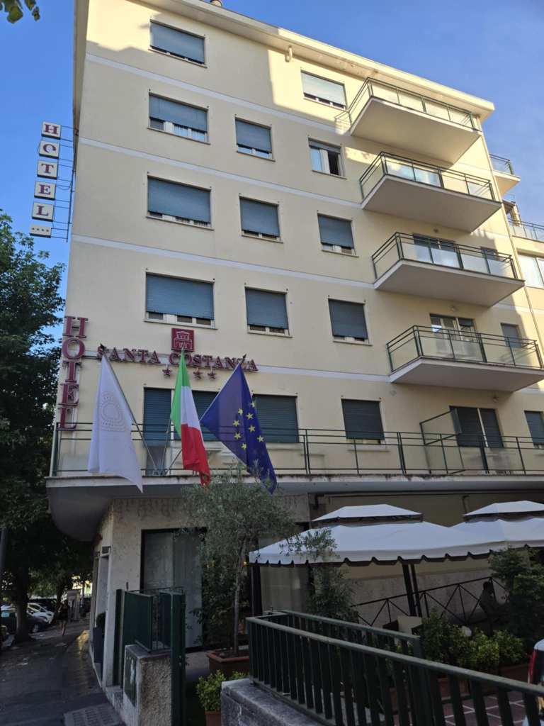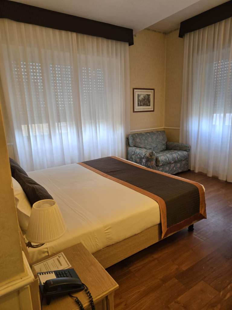 Quand on arrive finalement à destination, j’ai peine à le croire. Si les autres ont déjà pu profiter d’un après-midi pis d’une nuit ici en sortant de l’avion, moi, tout ce que j’en ai vu, c’est l’aéroport pis la gare Roma termini. 🤷♀️ Pour les deux nuits qu’on va passer dans la ville, notre groupe est divisé dans deux hôtels. Moi, je loge au Santa Costanza. Coup de chance, dorment aussi dans cet hôtel Sylvain, Nancy, Jocelyn, Michèle, Benoît, Nathalie, Jean, Caroline, Érick, Lyne, Marie-Antoinette, Marie-Yoleine pis Nargis. Je suis contente parce que c’est avec eux-autres que j’ai le plus sympatisé dans le groupe. Comme quoi, on peut pas toujours être badlucké. L’hôtel ici est un peu vieillot mais charmant pis très propre. « L’ascenseur » pour monter aux chambres a plutôt des allures de monte-charge dans lequel deux personnes maximum peuvent entrer. Benoît, qui a dormi ici lors de sa première nuit en Italie, me montre comment m’en servir. Je découvre par la suite ma chambre étincelante de propreté pis d’apparence confortable. Je suis ravie. 😍