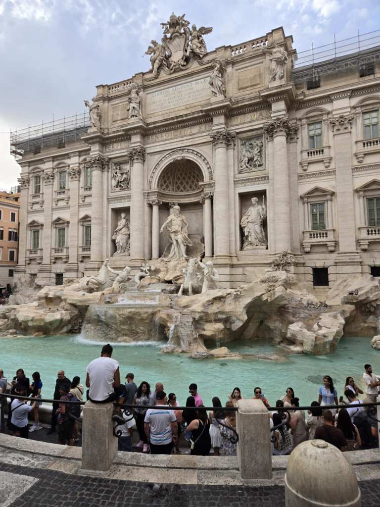 La fontaine se trouve à 4 km de l’hôtel. De la petite bière pour une marcheuse comme moi, d’autant plus que j’ai pas mal retrouvé mon énergie dans les dernières heures. En marchant, je jase un peu avec tout le monde. Jocelyn est pharmacien. Ça nous fait un point commun à discuter. En arrivant à la fameuse fontaine, je ressens une certaine émotion. 🫣 De un, c’est une attraction que je veux voir depuis très longtemps. De deux, j’étais vraiment déçue à l’idée de venir à Rome sans l’avoir vue, d’autant plus que j’avais apporté quatre pièces canadiennes à jeter dedans, une pour moi pis une pour chacun de mes enfants. La tradition ici, c’est de jeter sa pièce en se tenant dos à la fontaine puis de lancer avec la main droite, par-dessus l’épaule gauche. Malheureusement, y’a ben trop de monde pis une longue file pour accéder d’aussi près à la fontaine. ⛲ Jocelyn pis moi on décide de pitcher nos pièces de face, même si on est à plusieurs mètres du bassin. Jocelyn a un bon lancer. Sa pièce arrive facilement dans l’eau. 🏆