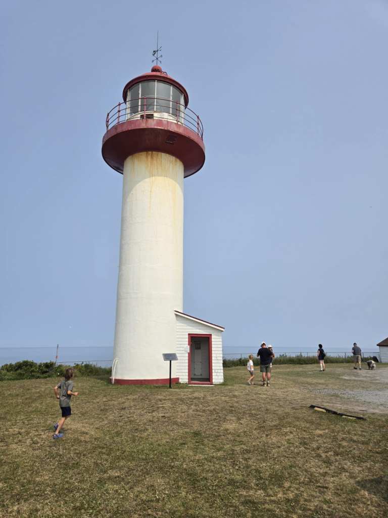 Bon, au moins quand t’arrives à Sainte-Madeleine, t’oublies tout ça. Rendu là, tu roules juste à côté de l’eau pis t’as pu autant de côtes pis de virages débiles. Je pense même que c’est là que la 132 est la plus belle. 🤩 Mais y’a une autre affaire à partir d’ici. Des risques d’éboulis. Plein de pancartes de risques d’éboulis. Non mais voulez-vous ben me dire à quoi ça sert de mettre ces pancartes-là ? 🤔 Pour vrai, qui parmi vous adapte sa conduite en voyant une pancarte d’éboulis ? 😂 Pis d’ailleurs, quessé qu’on est supposés faire de cette information-là ? Se préparer à attraper les roches si jamais ça dégringole ? 🤣 Ben non, y’a rien à faire. Tu roules comme d’habitude pis si jamais t’es badlucké pis que ça déboule pile quand tu passes, ben t’es dans la marde. 💩 That’s it. J’en suis à ces questionnements quand je décide de faire une petite pause méritée au phare du Cap-de-la-Madeleine justement. Aujourd’hui, c’est comme hier. Y pleut pas mais c’est un peu brumeux pis pas si chaud au bout du compte. Je me dégourdis un peu les jambes, je passe aux toilettes pis je m’assois quinze minutes à une table, le temps de manger une barre pis de gosser sur mon téléphone.