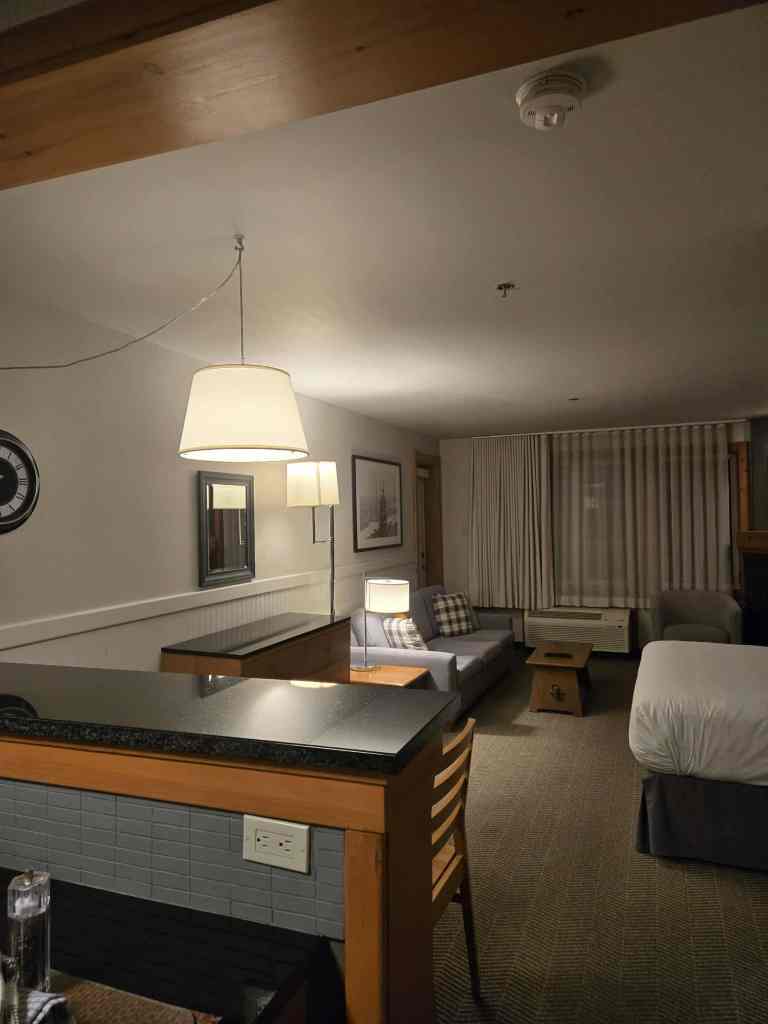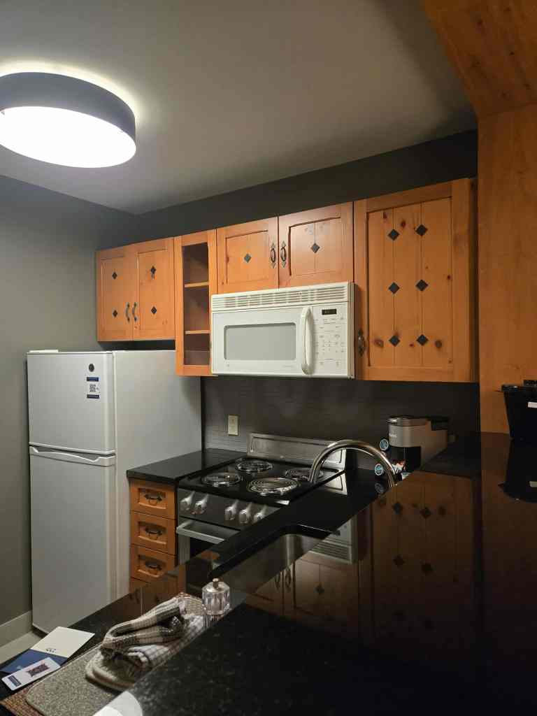18h45, nous vla à 15 km de notre destination finale. On s’arrête dans un IGA pour s’acheter à souper. Avec une bonne bière, bien entendu. 🍻 Pour le week-end, je nous ai réservé un petit studio au Lodge de la Montagne, à 150 mètres du centre pis des remontées mécaniques. En arrivant sur place, je constate qu’on a l’air bien situés mais avec la noirceur, on voit quedalle. Ça va aller à demain pour la découverte. Notre studio, lui, a ben de l’allure : petite cuisinette toute équipée, superbe et grande salle de bain, foyer, divan-lit, lit queen + grand balcon. Comme yé pratiquement 20h. quand on rejoint finalement la chambre, on soupe pis on passe une petite soirée tranquille. On est tous les deux fatigués de notre semaine. Je m’endors vers 23h. après un mal de ventre de fou rire à cause de William qui fait des montages avec une chanson de Gerry Boulet. 🤣🤣🤣 Je vous jure, cet enfant-là est vraiment divertissant. RIP Gerry, on a ben rit à soir. 🤣