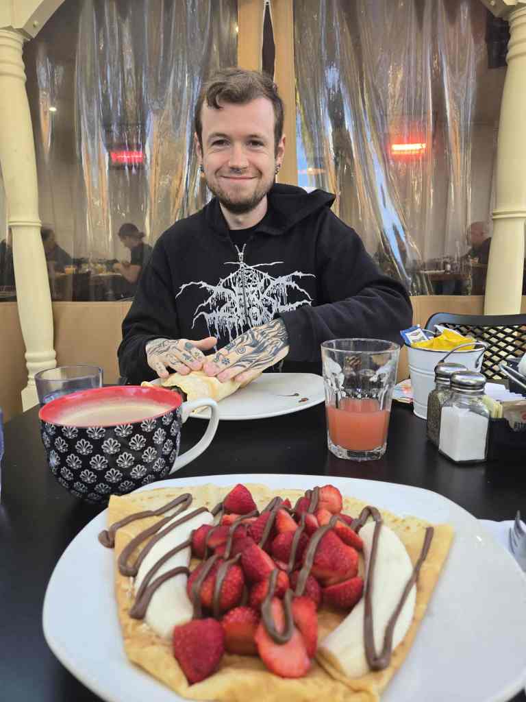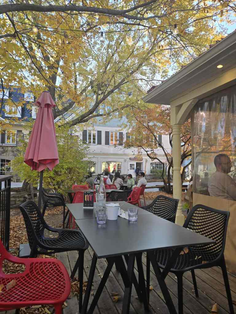 En me réveillant ce matin, j’ai une oreille sur deux de rétablie. C’est toujours pas le grand confort mais c’est ben mieux qu’hier soir. Aujourd’hui, on a programmé notre réveil à 8h30 pour avoir le temps de se préparer, de se ramasser pis d’aller manger tranquillement à pied avant le check out à 11h. Hier, en marchant dans le village, on a repéré une petite crêperie qui semblait ben sympathique. C’est là qu’on se dirige comme premier choix, en espérant qu’y reste deux petites places pour nous autres. Faque de la place, oui y’en a encore mais pas tant. Comme y fait doux, on opte pour une table sur la terrasse. Eille, qui aurait imaginé vla une couple d’années qu’on déjeunerait sur une terrasse un 19 octobre, à 9h. du matin pis qu’on serait confortable ? Impressionnant. Épeurant aussi. Les temps changent pis LE TEMPS change. C’est pas rassurant pour les futures générations. À la crêperie, on opte tous les deux pour la crêpe belle-mère aux bananes, fraises et nutella. 🥞 Bonjour les calories. C’est pas grave, on dînera pas. 😁