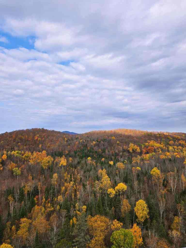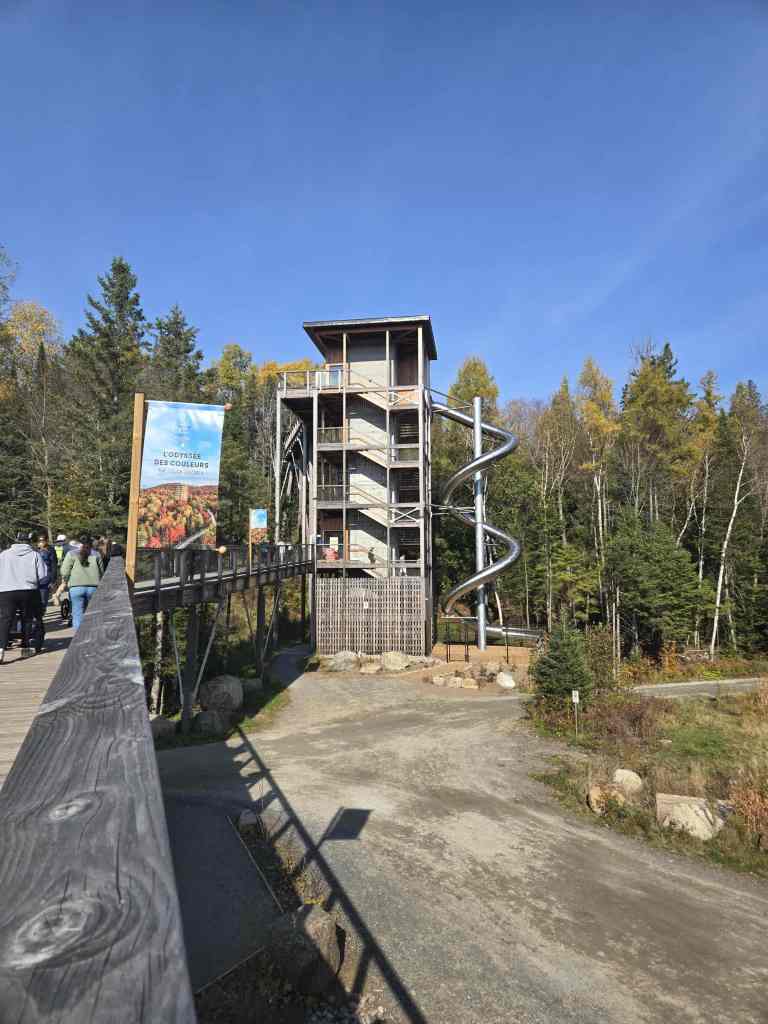 Notre petit déjeuner sur la terrasse est vraiment agréable. Au resto comme autour, y’a juste assez de monde mais pas trop. Sans la présence des voitures, les lieux sont paisibles. Le village est de toute beauté avec le ciel bleu, les couleurs des bâtiments pis celles des arbres. Le déjeuner est bon. Tout est parfait. 😍 Je reviendrai assurément me promener dans le coin, sans grimper la maudite montagne cependant. 🙅♀️ Une fois dans une vie, c’était ben assez. En quittant notre lodge, on se dirige par des petits chemins de campagne vers le Sentier des cimes. Ste sentier-là, ça fait un petit bout de temps que je veux le faire mais j’attendais l’automne pour y aller. En fait, c’est cette activité-là qui a été le point de départ de toute notre fin de semaine. Tant qu’à rouler jusque-là, c’était aussi bien de rouler vingt autres kilomètres pour profiter un peu de Tremblant. Faque le Sentier des cimes, c’est un assez long parcours sur passerelle, en pleine nature, avec pour point culminant une impressionnante tour de 40 mètres de hauteur offrant un magnifique point de vue à 360º sur forêts et montagnes. Le site est de toute beauté. 🤩