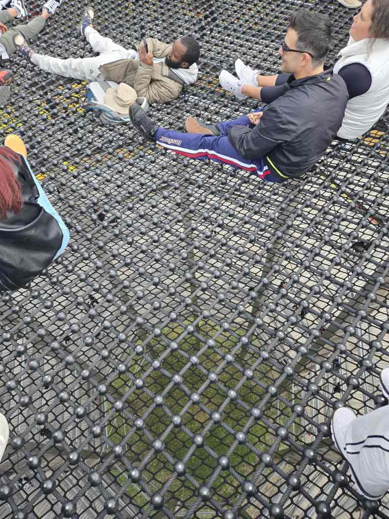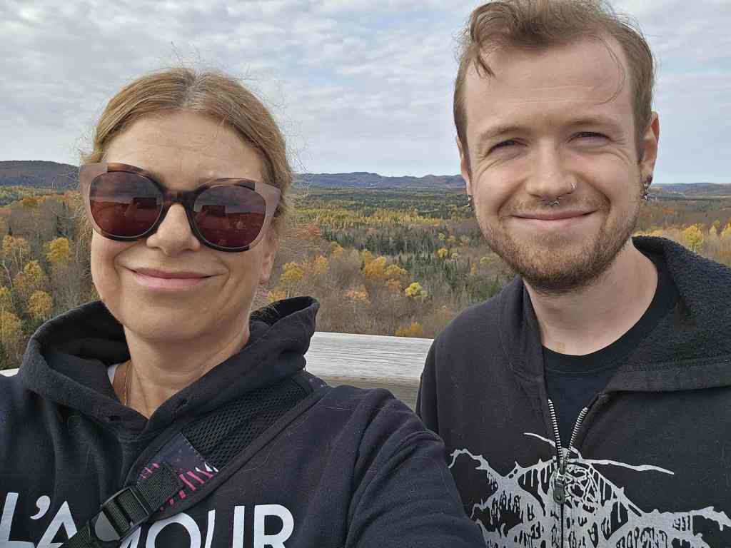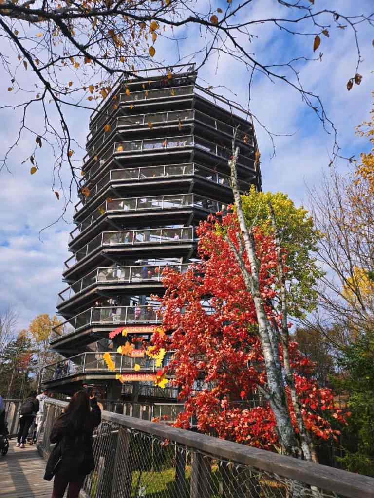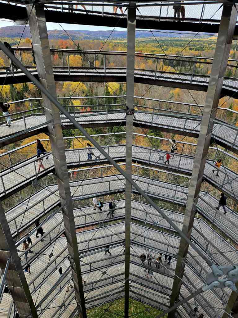 Avec William, on traverse la passerelle pis on monte au sommet de la tour. Pour information, monter là, c’est accessible pour n’importe qui, même avec une poussette ou un fauteuil roulant. ♿ Rien à voir avec notre escalade d’hier. 🤣 Tout en haut de la tour, le panorama est extraordinaire avec toutes les belles couleurs de l’automne. Manque juste un peu de ciel bleu pour que ce soit parfait. J’en profite pour prendre quelques photos puis je m’aventure sur le filet suspendu à 40 mètres au-dessus du vide. Non, j’aime toujours pas les hauteurs mais après la plate forme vitrée de 200 mètres à Percé pis le sol de verre au 101ième étage du Edge Observatory de New York, c’est pas avec 40 mètres qu’on va se dégonfler. 🫠