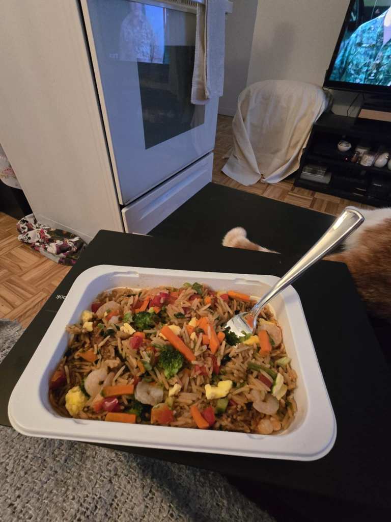 En après-midi, je sors me faire faire les ongles pis sul chemin du retour, j’arrête au Tim Hortons acheter une petite carte-cadeau à Guy pour le remercier. 🎁 Oui, je le sais, y’était payé pour travailler chez nous mais y’a fait beaucoup d’extras pour m’accommoder, comme démonter ma table de cuisine la semaine passée, rebrancher mon lave-vaisselle aujourd’hui, installer quelques accessoires pis courir les spéciaux pour acheter certains items mieux que prévu. Aussi, y s’est toujours arrangé pour me laisser les lieux le plus propre pis vivable possible. Initialement, je voulais y acheter une bouteille de vin mais je sais pas si y boit. Par contre, chaque fois que je l’ai croisé le matin, y’avait toujours un café du Tim faque je me suis dit qu’une carte-cadeau, c’était une valeur sûre. Avant de rentrer à la maison, j’arrête aussi au IGA pour m’acheter un repas à réchauffer au micro-ondes pour souper. Là, je pense que je commence à avoir fait le tour des menus tout faits de l’épicerie : poke bowl, soupe, pâtes, pizza, salade… Je pensais jamais dire ça mais j’ai hâte de me cuisiner quelque chose moi-même. 😄 Pour ce soir, c’est riz frit au crevettes signé Ricardo. 🍚 C’est mieux d’être bon.